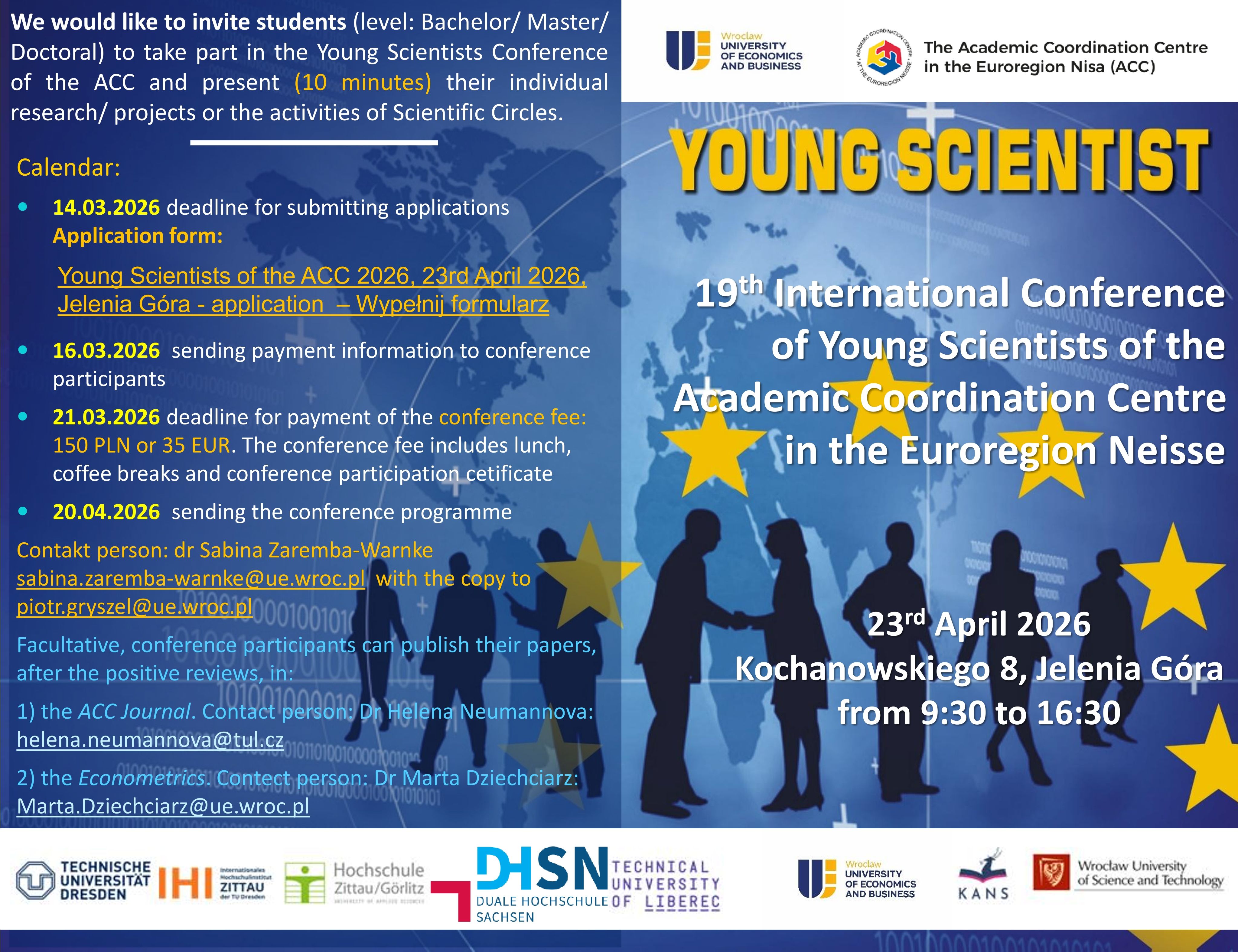 Dne 23. dubna se bude konat v polské Jelení Hoře již 19. ročník mezinárodní soutěže pro doktorandy a studenty vysokých škol v Euroregionu NISA. Můžete zde prezentovat svůj výzkumný záměr v rámci SVOČ, téma své diplomové či bakalářské práce nebo téma, které je předmětem Vašeho zájmu. Představení tématu proběhne formou cca 10-minutové prezentace v angličtině, kterou bude hodnotit mezinárodní porota.