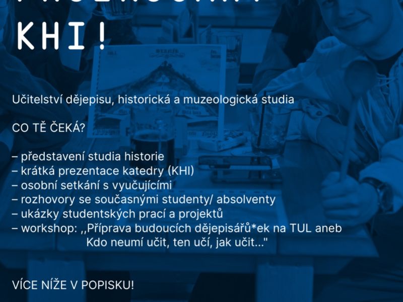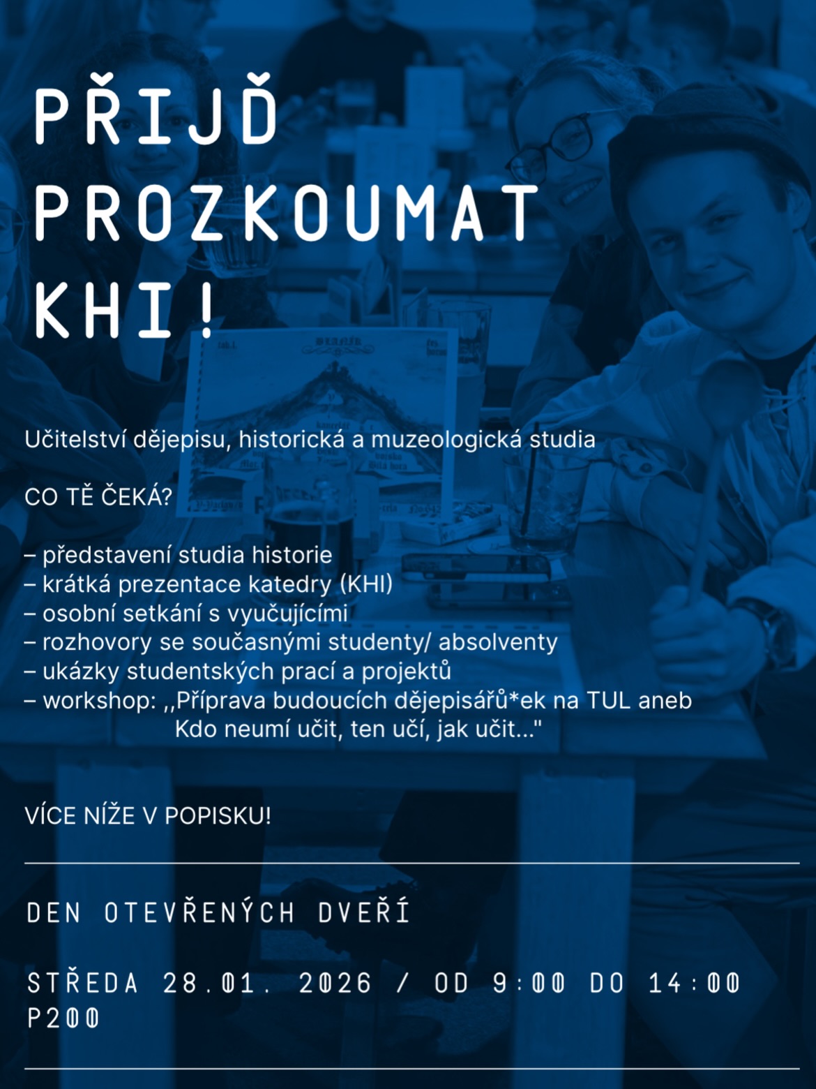Vážené uchazečky a uchazeči o studium na katedře historie FP TUL, zveme Vás na tradiční Den otevřených dvěří, který se na naší fakultě uskuteční ve středu 28. ledna 2026 od 9 do 14 hodin. Naše vyučující i studující najdete jak na budově G v univerzitním kampusu u Husovy ulice, tak také v budově P v Komenského ulici, kde katedra historie sídlí. Velice rádi s Vámi probereme veškeré dotazy ke studiu, které je u nás možné absolvovat v bakalářském, magisterském i doktorském stupni!