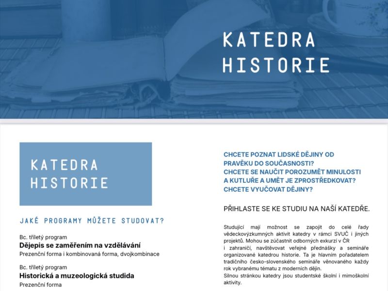Mimoto se zde budete moci seznámit s vědeckými a publikačními aktivitami studujících i vyučujících, akcemi katedry historie i studentským životem.