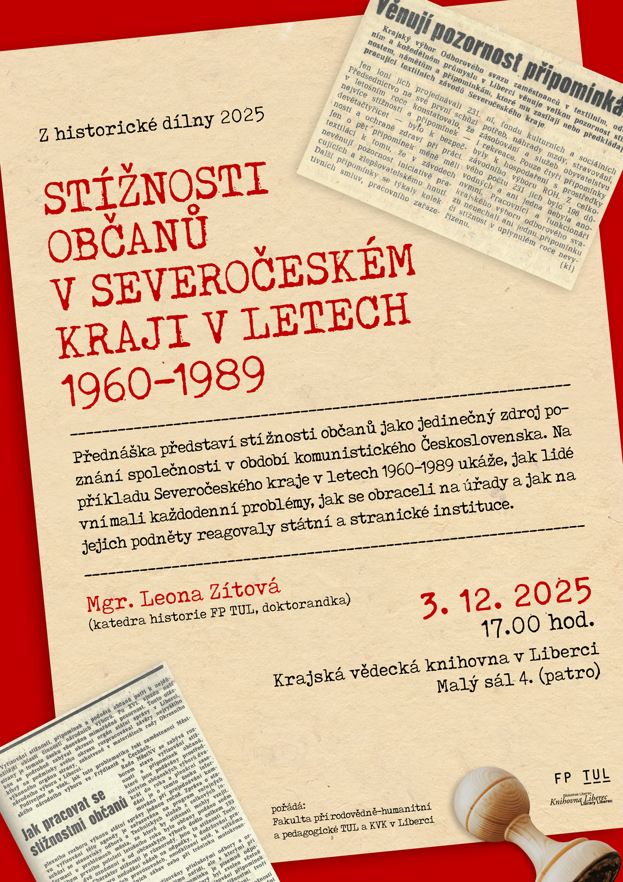 Přijměte pozvání na poslední doktorandskou přednášku letošního roku, která se bude věnovat tématu stížností občanů v Severočeském kraji v letech 1960-1989. Přednáška představí stížnosti občanů jako jedinečný zdroj poznání společnosti v období komunistického Československa. Na příkladu Severočeského kraje v letech 1960–1989 ukáže, jak lidé vnímali každodenní problémy, jak se obraceli na úřady a jak na jejich podněty reagovaly státní a stranické instituce.