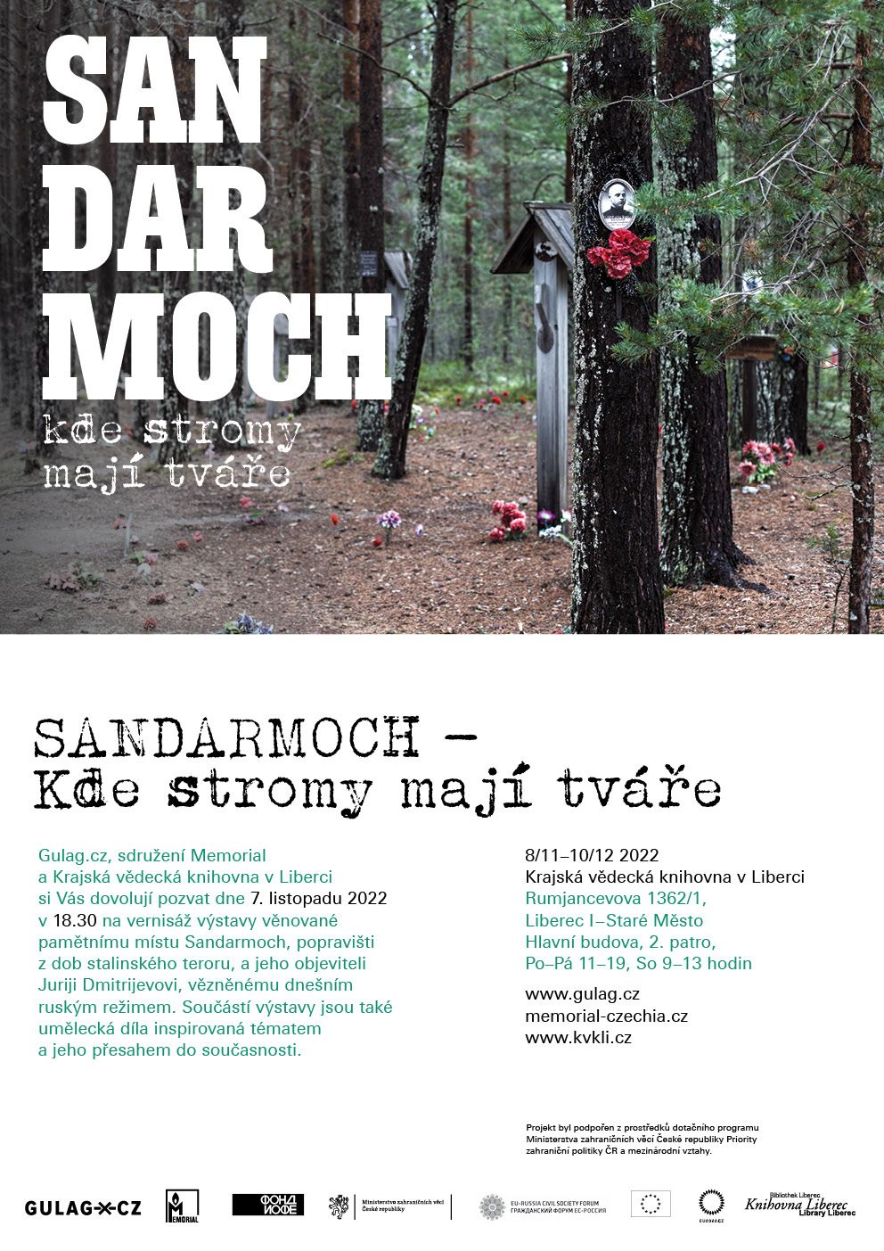 Srdečně Vás zveme na vernisáž výstavy "Sandarmoch - kde stromy mají tváře", kterou připravují organizace Gulag.cz a sdružení Memorial ve spolupráci s Krajskou vědeckou knihovnou v Liberci. Vernisáž se uskuteční dne 7. listopadu 2022 v 18:30 ve 2. patře hlavní budovy knihovny v Liberci. Součástí vernisáže bude také komentovaná prohlídka.