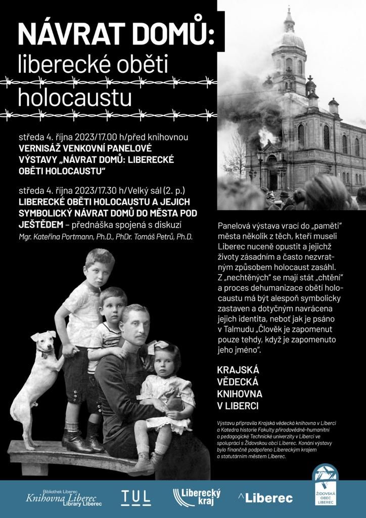 Vernisáž se koná dne 4. 10. 2023 v 17.00 hod před knihovnou. Následovat bude přednáška od 17.30 hod ve Velkém sále ve 2.p KVK dr. Kateřiny Portmann s názvemLibrecké oběti holocaustu a jejich symbolický návrat domů do města pod Ještědem.