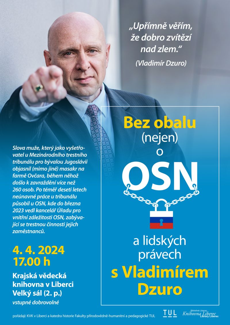 Nenechte si ujít setkání s Vladimírem Dzuro, bývalým vyšetřovatelem Mezinárodního trestního tribunálu pro bývalou Jugoslávii, který také vedl kancelář Úřadu pro vnitřní záležitosti OSN dne 4. dubna 2024 od 17.00 hod ve Velkém sále ve 2. patře Krajské vědecké knihovny v Liberci.