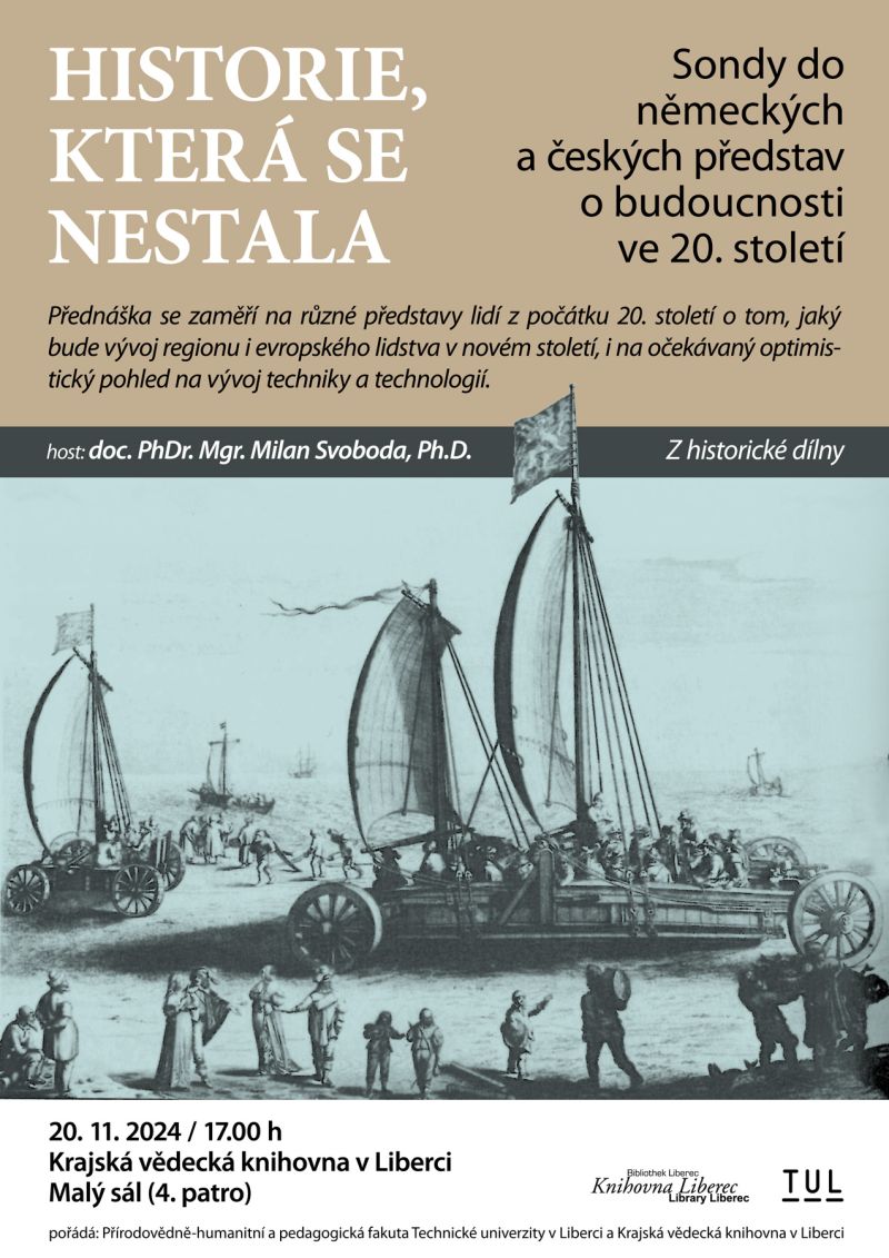 Dovolujeme si Vás pozvat na přednášku člena KHI FP TUL, doc. PhDr. Milana Svobody, Ph.D.: Historie, která se nestala. Sondy do německých a českýh představ o budoucnosti ve 20. století z cyklu přednášek Z historické dílny, která se uskuteční dne 20.11.2024 od 17.00 hod. v Malém sále ve 4. patře Krajské vědecké knihovny v Liberci.