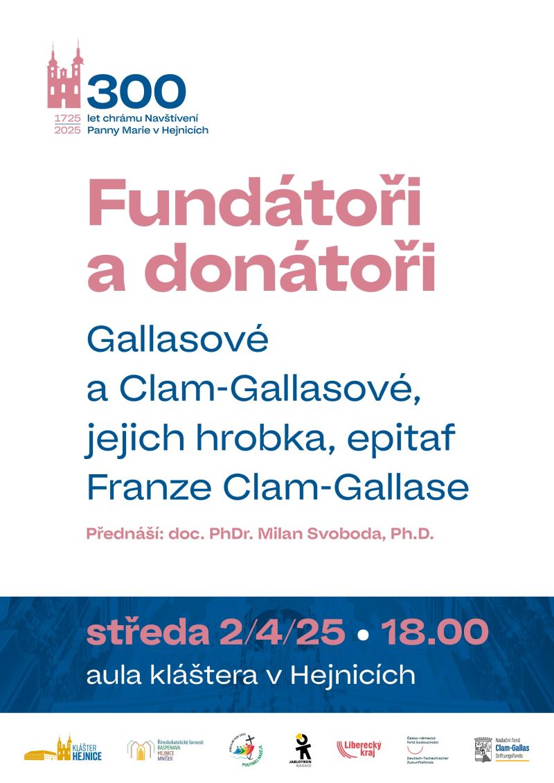 U příležitostí 300 let chrámu Navštívení Panny Marie v Hejnicích Vás zveme na přednášku doc. Milana Svobody "Fundátoři a donátoři. Gallasové a Clam-Gallasové, jejich hrobka, epitaf Franze Clam-Gallase" dne 2.4.2025 v 18.00 hod v aule kláštera v Hejnicích.