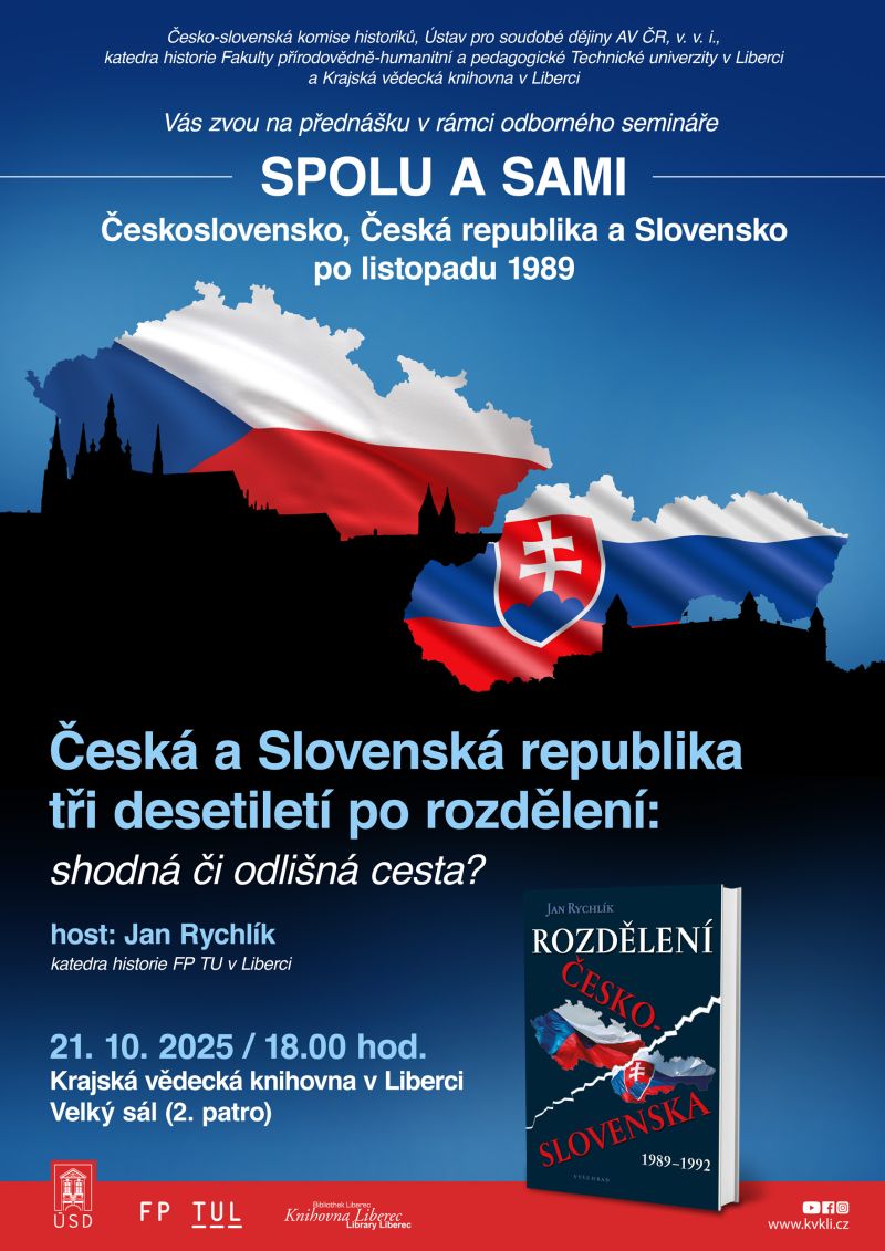 Česko-slovenská komise historiků, Ústav pro soudobé dějiny AV ČR, v.v.i., katedra historie FP TUL a KVKLI zvou na odborný seminář Spolu a sami. Československo, Česká republika a Slovensko po listopadu 1989, který se bude konat ve dnech 21.10. a 22.10. 2025 ve 2 p. Krajské vědecké knihovny v Liberci.