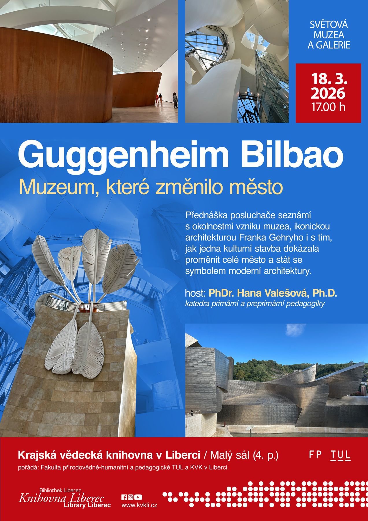 Zveme Vás na první přednášku letošného cyklu Světová muzea a galerie, které se ujme PhDr. Hana Valešová, Ph.D. z katedry primární a preprimární pedagogiky FL TUL. Posluchačům paní doktorka představí Guggenheimovo muzeum v Bilbau jako jedinečný fenomén na pomezí architektury, umění a městského rozvoje. Současně je seznámí s okolnostmi vzniku muzea, ikonickou architekturou Franka Gehryho i s tím, jak jedna kulturní stavba dokázala proměnit celé město a stát se symbolem moderní architektury.