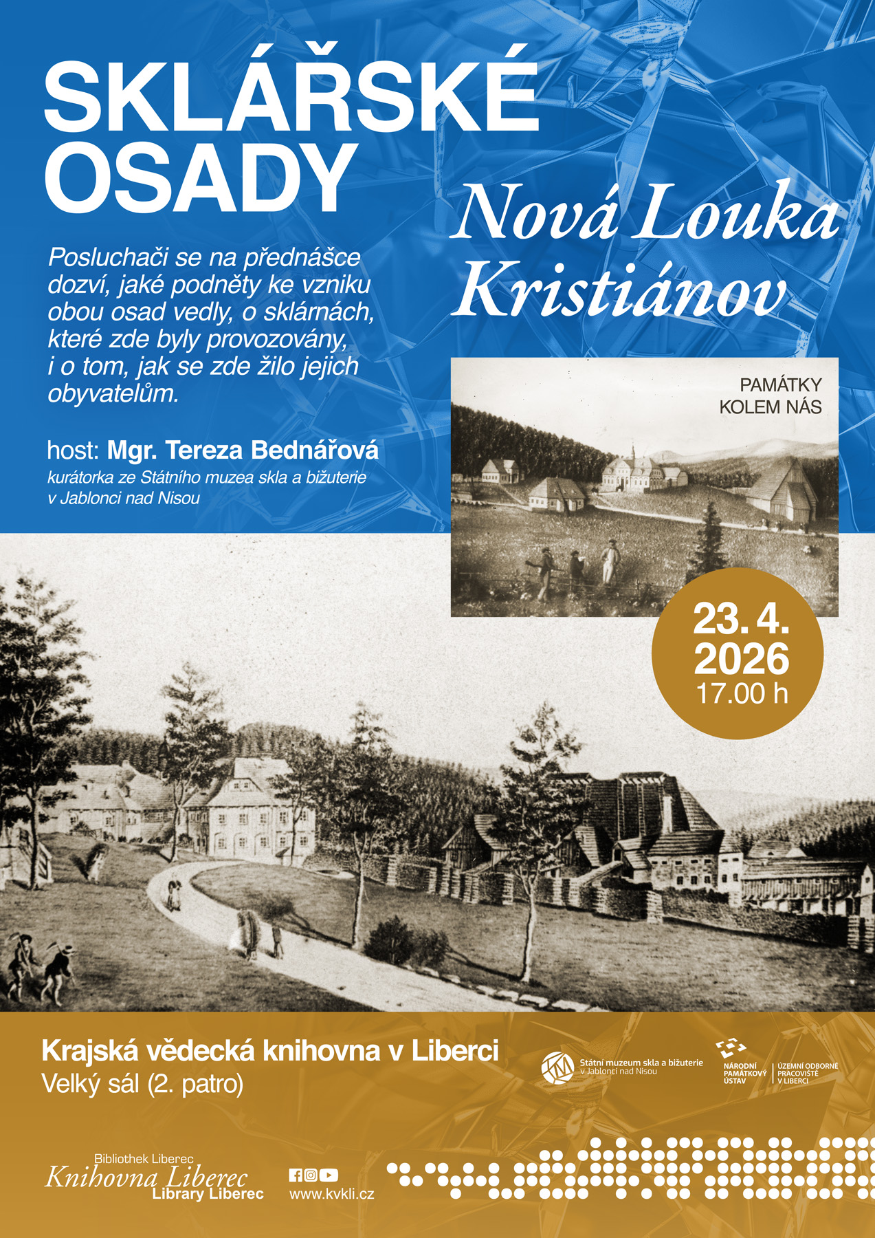 Ve velkém sále Krajské vědecké knihovny v Liberci se ve čtvrtek 24. dubna 2026 od 17 hodiny uskuteční přednáška kurátorky Státního muzea skla a bižuterie v Jablonci nad Nisou Terezy Bednářové o sklářských osadách Nová Louka a Kristiánov.