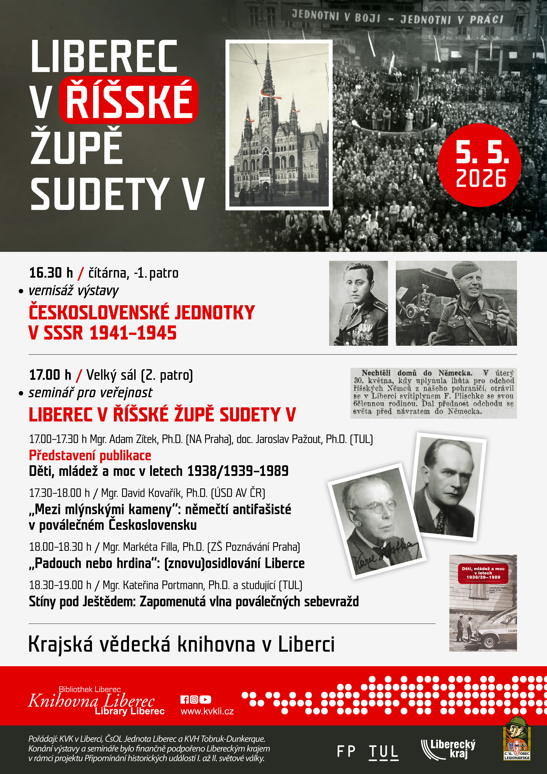 Pátý ročník odborného semináře pro veřejnost představí novinky z výzkumu událostí v Liberci a života jeho obyvatel těsně konci druhé světové války. Tematicky bude rozdělen do tří bloků, které se budou věnovat osudu německých antifašistů, včetně poválečného příběhu bývalého libereckého starosty Carla Kostky, novým osídlencům a vládnoucí elitě Liberce a v neposlední řadě fenoménu poválečných sebevražd, jejichž vlna zachvátila Liberec v letních a podzimních měsících roku 1945. Součástí semináře bude rovněž představení nové kolektivní monografie Děti, mládež a moc v letech 1938/1939–1989, kterou vydala Technická univerzita v Liberci s Národním archivem. Publikace pojednává mimo jiné také o válečných událostech, které se týkaly mládeže z Liberce, a to jak té, jež se zúčastnila československého odboje, tak také členů Hitlerjugend. Příspěvky přednesou pracovníci Ústavu pro soudobé dějiny Akademie věd České republiky, Technické univerzity v Liberci, Národního archivu a ZŠ Poznání Praha.